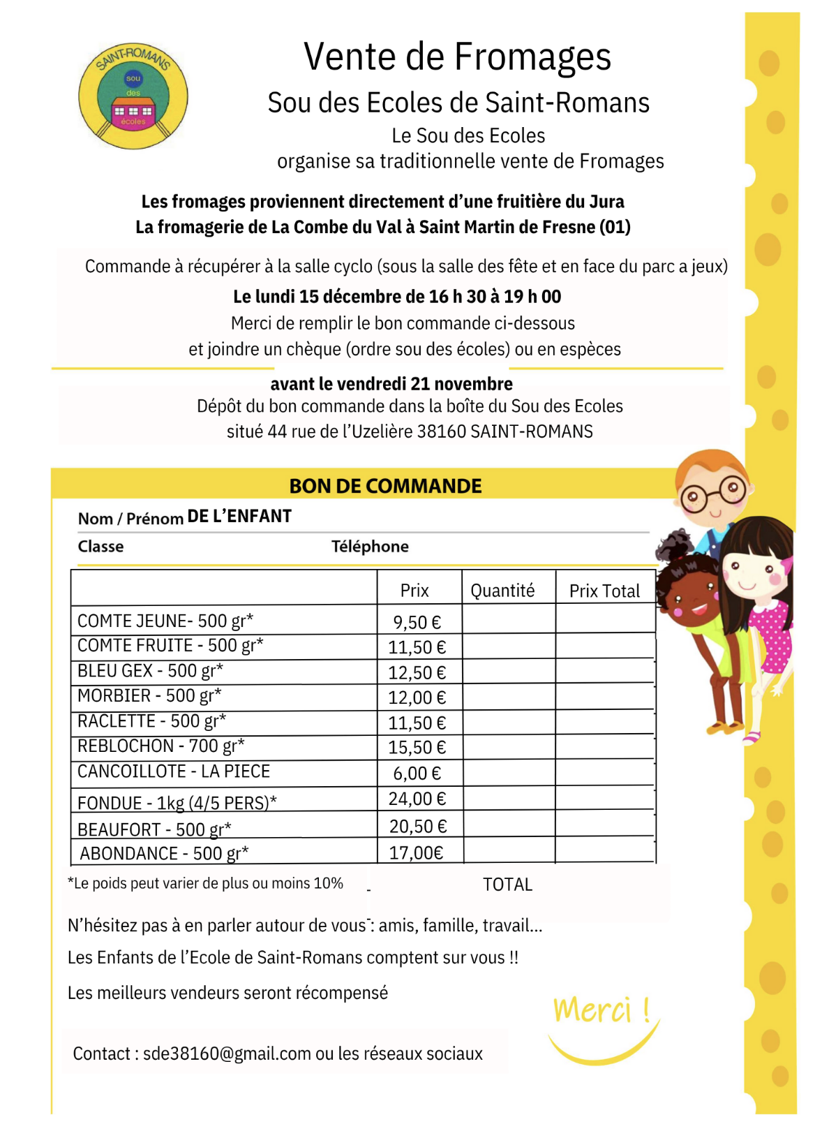 Le Sou des écoles de St Romans organise sa traditionnelle vente de Fromages.